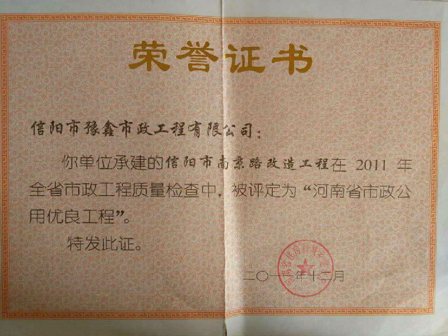 好風(fēng)憑借力,送我上青云。近年來(lái),公司積極參與城市市政基礎(chǔ)設(shè)施建設(shè)施工,積極參與市場(chǎng)競(jìng)爭(zhēng),先后承擔(dān)施工了市政府重點(diǎn)工程南京路道路改造工程、春曉路道路改造工程,東方紅大道道路改造工程、龍江東路新建工程等重點(diǎn)民生工程,其中南京路道路改造工程被省建設(shè)廳評(píng)為“中州杯”, 春曉路和東方紅大道道路改造工程被省建設(shè)廳評(píng)為“省優(yōu)工程”,成為城區(qū)一道道亮麗的風(fēng)景線。參與施工了市典范小區(qū)“臺(tái)北城上城”、“恒大名都”以及師范學(xué)院、職業(yè)技術(shù)學(xué)院、交警支隊(duì)和軍區(qū)道路工程,參與施工了雞公山管理區(qū)、南灣管理區(qū)、明港鎮(zhèn)和羅山縣等部分道路小區(qū)工程施工,累計(jì)大小各類施工工程三百余項(xiàng),企業(yè)影響力不斷擴(kuò)大、輻射力不斷增強(qiáng),市場(chǎng)份額不斷提高,企業(yè)信譽(yù)不斷彰顯,為信陽(yáng)城市建設(shè)做出了積極貢獻(xiàn),為企業(yè)的可持續(xù)發(fā)展插上了騰飛的翅膀。